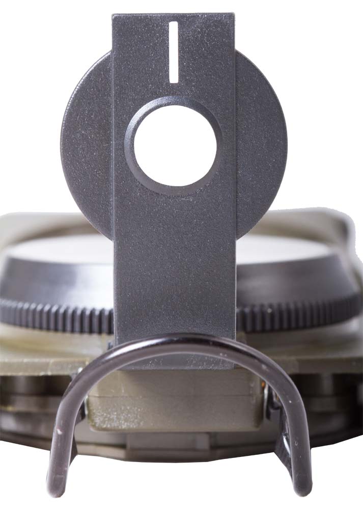 La tapa de la brújula contiene un punto de mira que, junto con el situado en la parte superior de su lupa, le permitirán establecer la dirección con gran exactitud. La correa para pulgar situada cerca del punto de mira se utiliza para sujetar la brújula en su sitio. Los laterales de la brújula están graduados con escalímetros para poder trabajar con mapas.