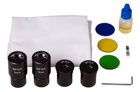 El revólver giratorio está diseñado para acomodar cuatro objetivos. Combinándolos con oculares intercambiables de diferentes aumentos, puede obtener una amplia gama de aumentos fijos en el rango de 40x a 2000x. Todos los oculares que se entregan con el equipo son oculares emparejados.