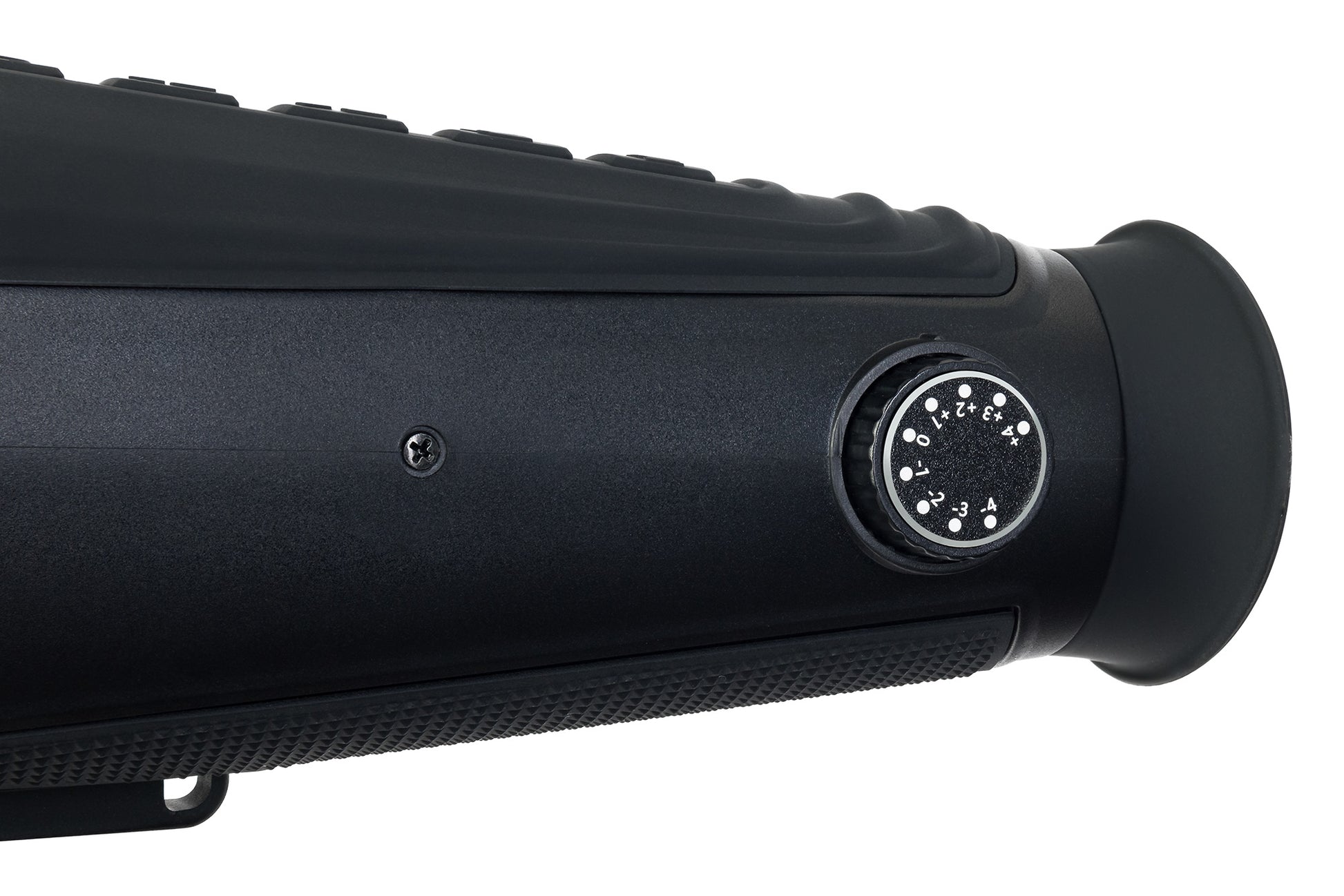 Además de la imagen en color estándar durante el día y en blanco y negro por la noche, puede obtener otros dos tipos de imagen mediante efectos visuales especiales: verde brillante y película en color. También puede activar el modo blanco y negro para observaciones diurnas. El monocular tiene un aumento digital que puede ajustarse de 1 a 8x. El ángulo de visión es de 10°; el monocular en sí es bastante miniaturizado y tiene un objetivo pequeño. La distancia mínima de trabajo es de 3 m.
