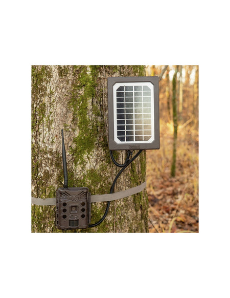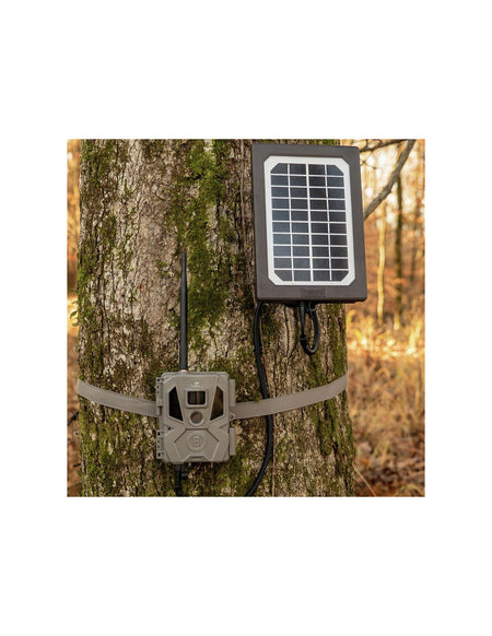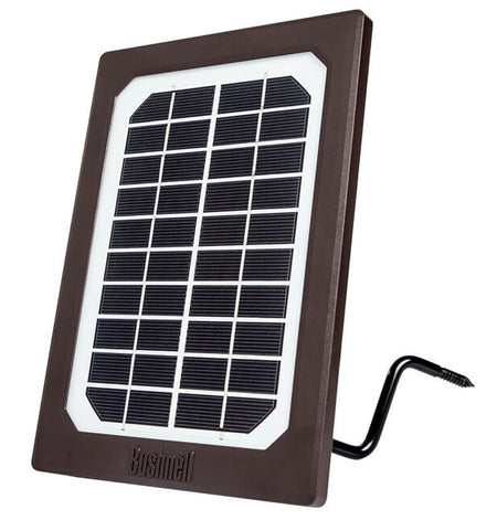 El panel solar de Bushnell está diseñado para funcionar como una fuente de energía suplementaria para todos los modelos actuales de las cámaras Trophy Cam HD Aggressor, Trophy Cam HD Aggressor Wireless, Impulse, Core, CelluCore y las de la serie Prime. Con el panel solar montado cerca de su cámara y conectado a la toma de entrada de alimentación externa, notará que las pilas de la cámara duran mucho más antes de que sea necesario cambiarlas. El panel solar tiene una batería de iones de litio interna, que las células solares cargan continuamente cuando se exponen al sol. Una vez conectada, la cámara extraerá energía de la batería de litio cargada del panel solar durante el mayor tiempo posible y cambiará a las pilas solo cuando el nivel de carga de la batería del panel solar sea demasiado bajo. Como resultado, las pilas de la cámara tendrán una vida útil considerablemente más larga.