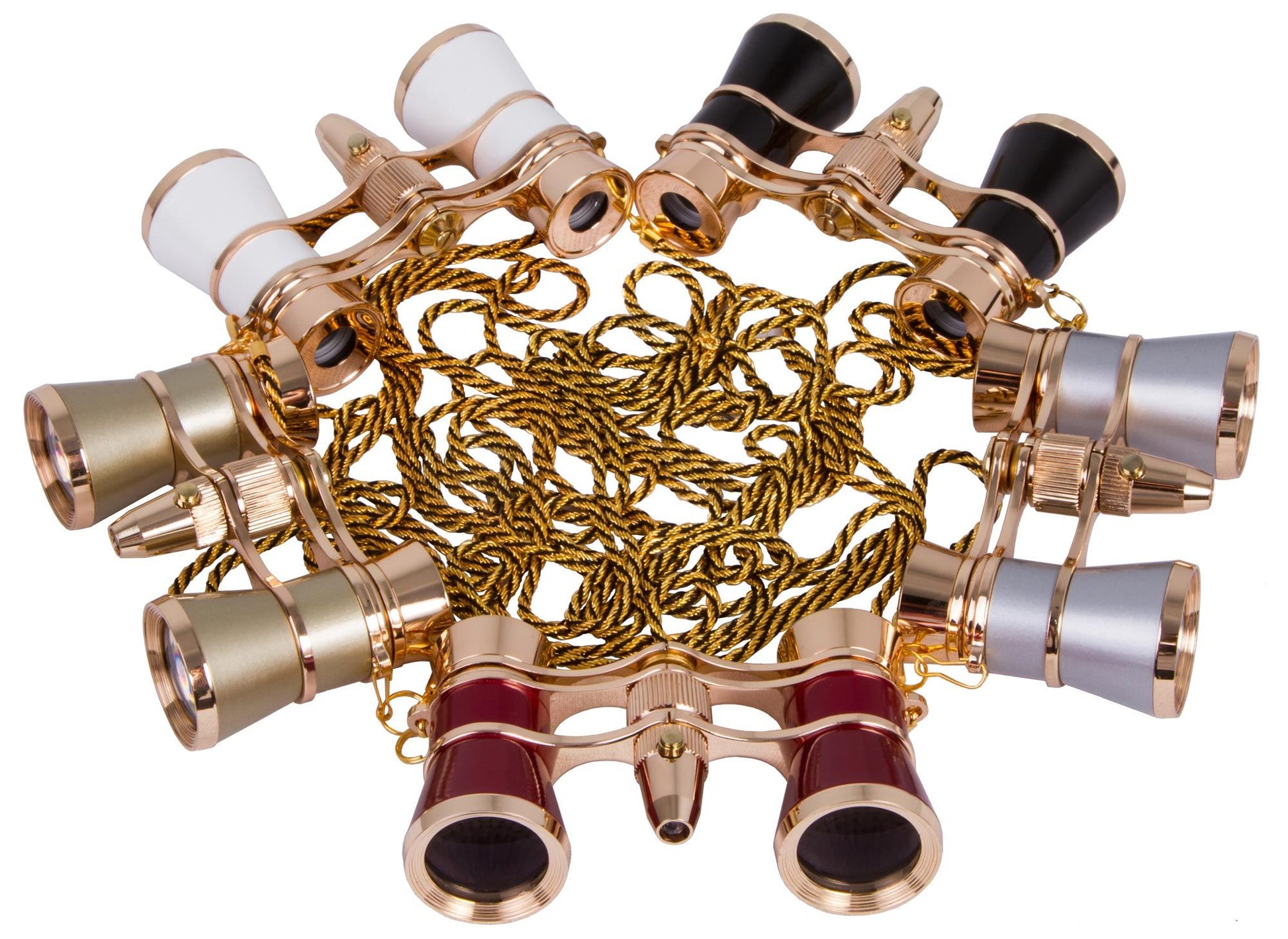 Gama Levenhuk Broadway 325F: elegantes binoculares de teatro con luz LED. Los binoculares vienen equipados con una fina cadena metálica. Cada modelo se entrega con una suave funda y con un pañito de limpieza. La caja de embalaje tiene impreso un dibujo relacionado con el teatro.