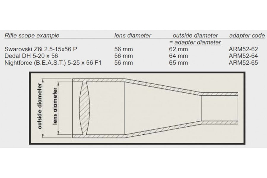 El adaptador Adaptador Dedal 5XX, es valido para todos los clipon de Dedal. También lo podemos usar en otros dispositivos clipon de otras marcas. Le recomendamos nos llame para aclarar todas las dudas antes de la compra.Se ajusta al diámetro exterior de la óptica de día.Existen medidas para poder adaptar dispositivos ópticos de hasta 80mm.