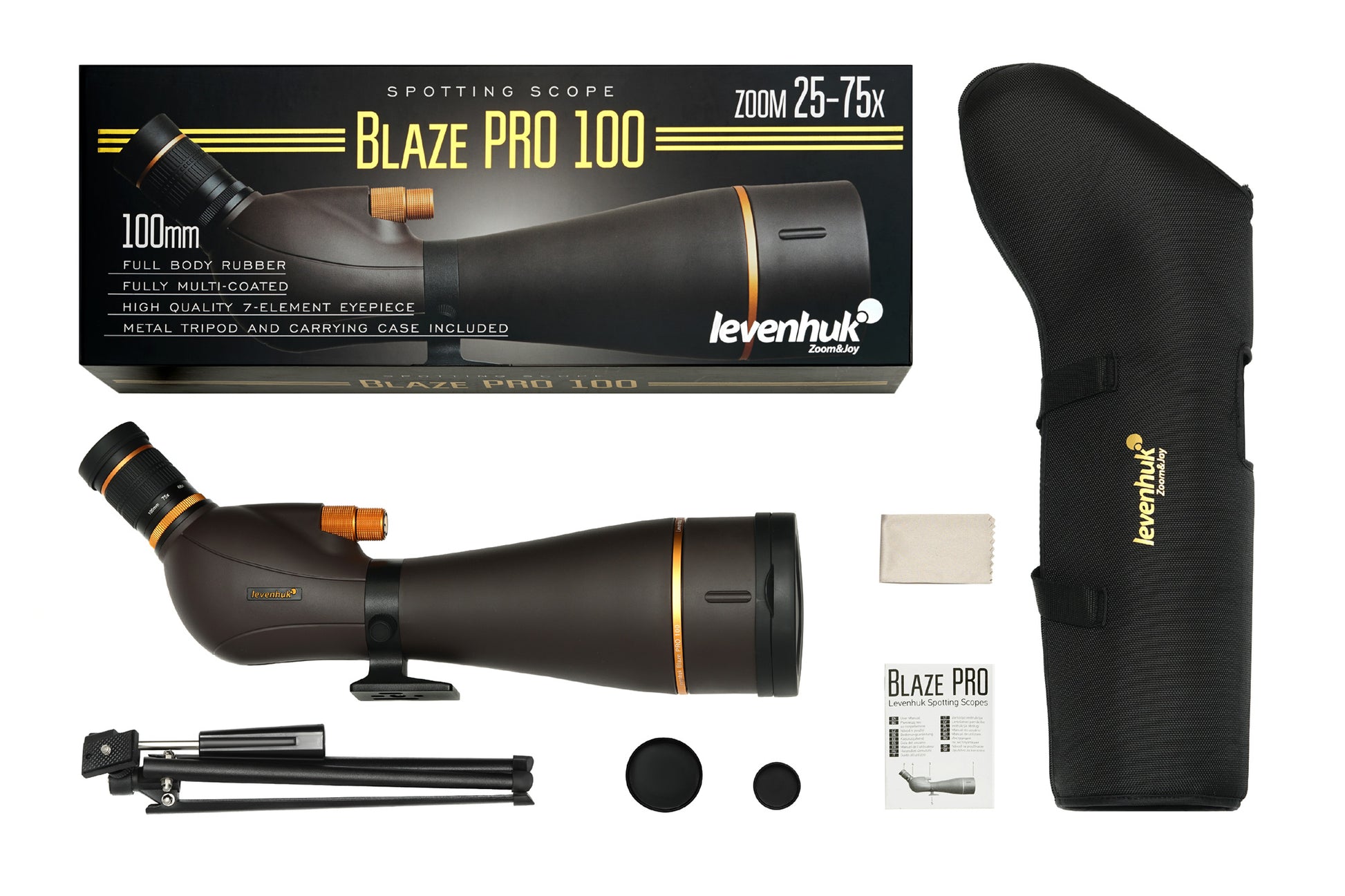 El Levenhuk Blaze PRO 100 es el modelo de gran apertura más potente de esta gama Levenhuk Blaze PRO de catalejos profesionales. Este modelo tiene hasta 75 aumentos, con un objetivo de 100 mm de diámetro. Por sus características ópticas, este catalejo es equivalente a un telescopio amateur. Además, su montura lo protege frente al mal tiempo, las lentes no se empañan y los aumentos pueden modificarse dentro de un amplio rango. El Levenhuk Blaze PRO 100 será un verdadero tesoro para aquellas personas a las que les guste explorar la diversidad de la vida salvaje.