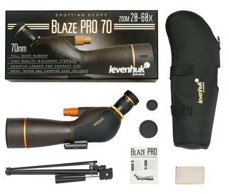 Los catalejos Levenhuk Blaze PRO 70 cuentan con un objetivo con zoom que permite cambiar los aumentos con suavidad dentro de un amplio rango, para que pueda elegir los aumentos adecuados para su observación. Su ocular en ángulo permite observar la zona circuncenital con comodidad, observar aves o estudiar la copa de un árbol.