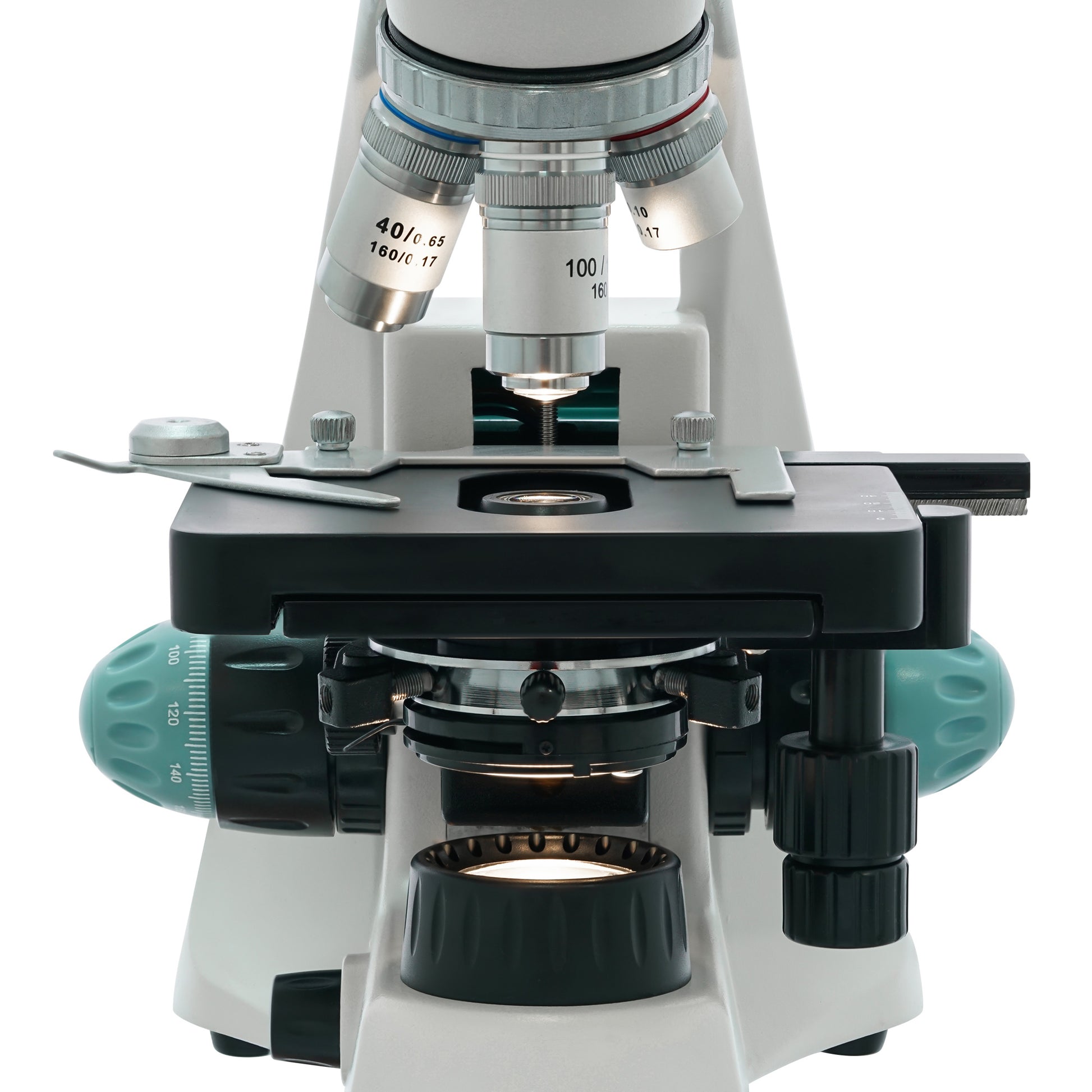 El microscopio está equipado con una platina provista de un micrómetro mecánico que ayuda a colocar la muestra con precisión debajo del objetivo. Debajo de la platina, hay un condensador Abbe de altura ajustable con un diafragma iris. Puede instalar un filtro de luz en el soporte especial para filtros. La potente iluminación halógena está equipada con una lente colectora. El brillo es ajustable. La iluminación funciona con una fuente de alimentación CA.