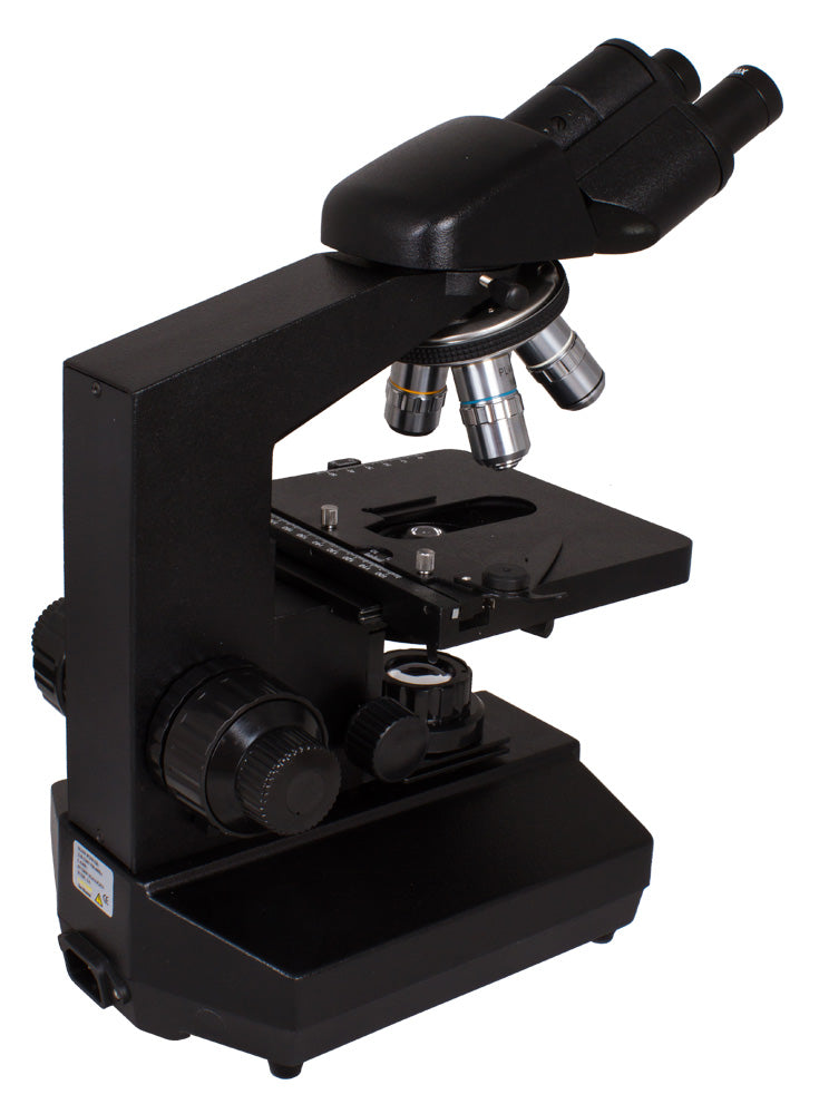 Además, es binocular y giratorio. Su revólver giratorio permite ajustar la posición de cuatro objetivos, está inclinado 30 grados y permite una rotación de 360 grados sobre su eje. El microscopio cuenta con el sistema clásico de iluminación Kehler, con ajustes del diafragma de campo y apertura.