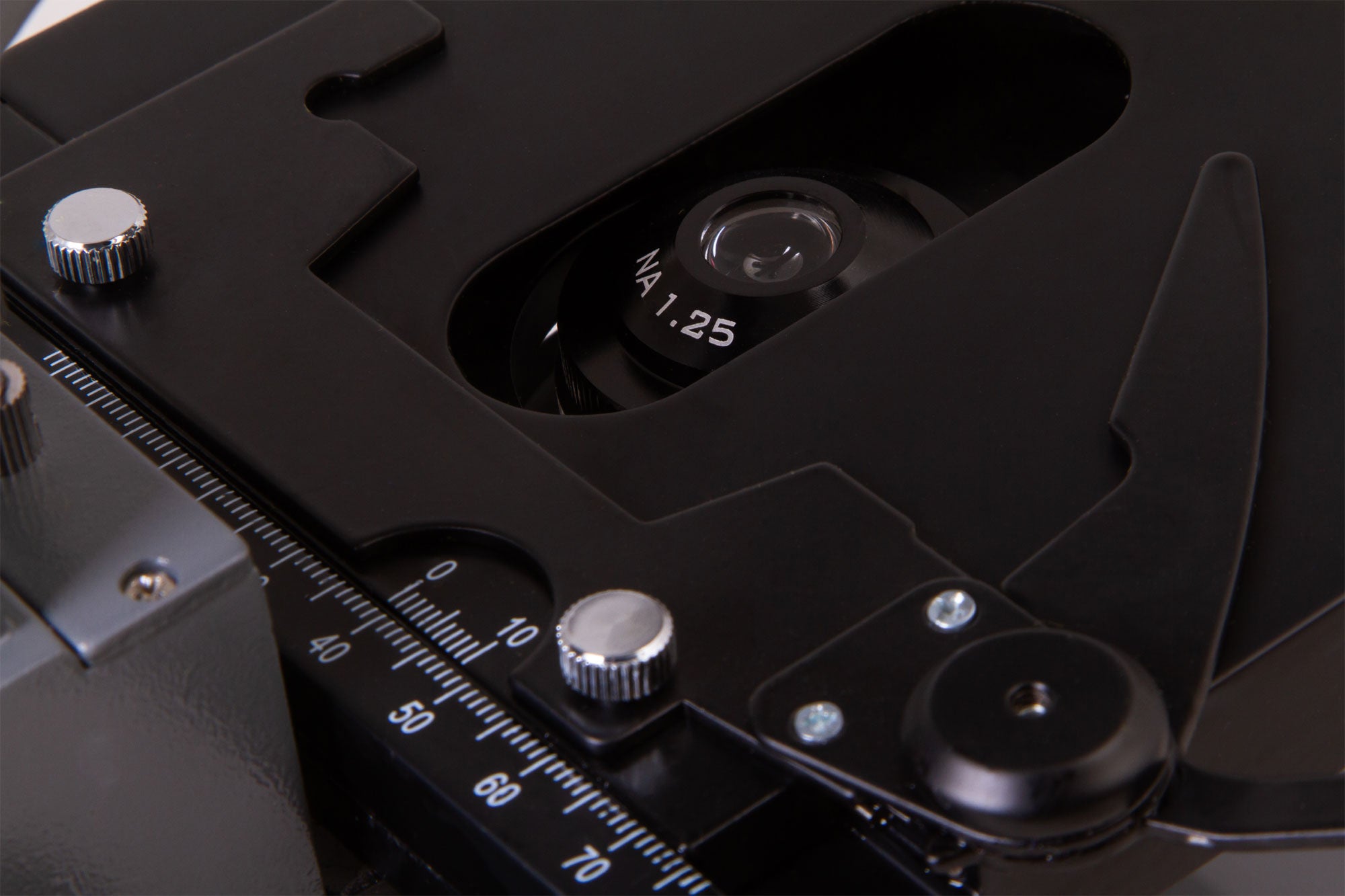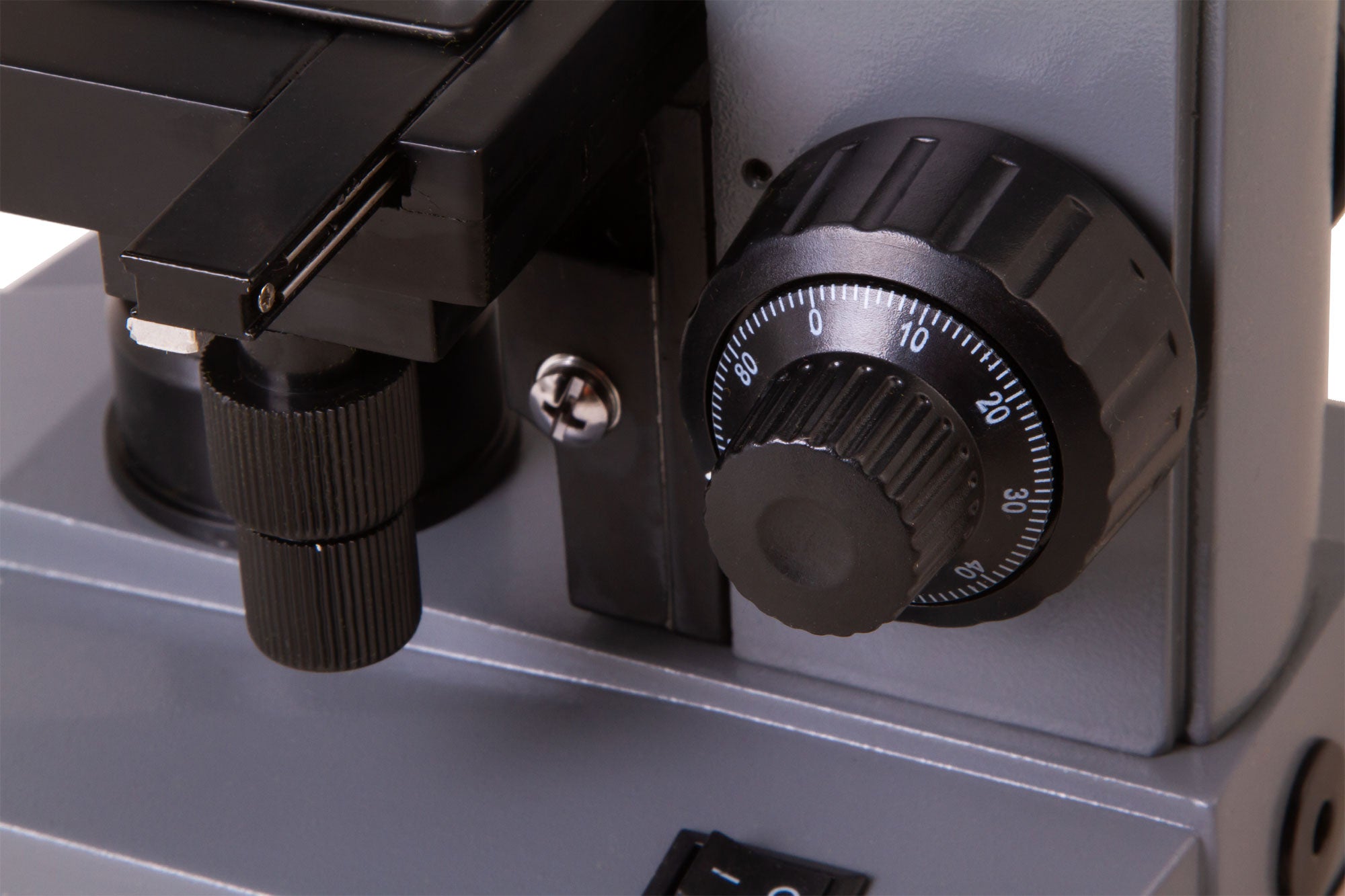 La platina está equipada con un micrómetro mecánico, que permite posicionar las muestras de forma rápida y precisa bajo el objetivo. El ajuste de la nitidez se realiza de la mejor manera posible mediante controles de ajuste aproximado y ajuste fino. Debajo de la platina hay un condensador Abbe con un diafragma iris. Debajo de la platina se encuentra el sistema de iluminación LED, cuyo brillo es ajustable. La iluminación se puede alimentar por corriente alterna o con pilas.