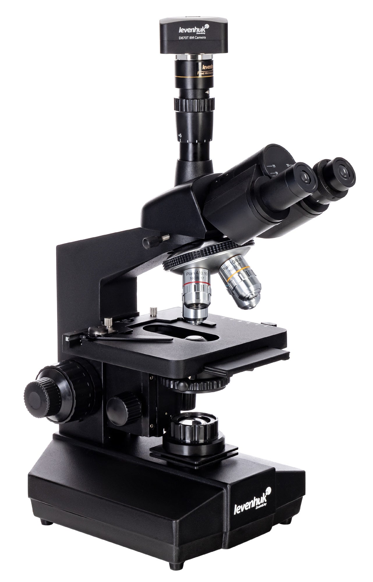 El microscopio trinocular digital Levenhuk D870T 8M es además compatible con las cámaras digitales Levenhuk (las cámaras adicionales se venden por separado). Las cámaras Levenhuk se instalan en el tubo del ocular en lugar del mismo.