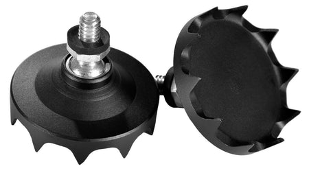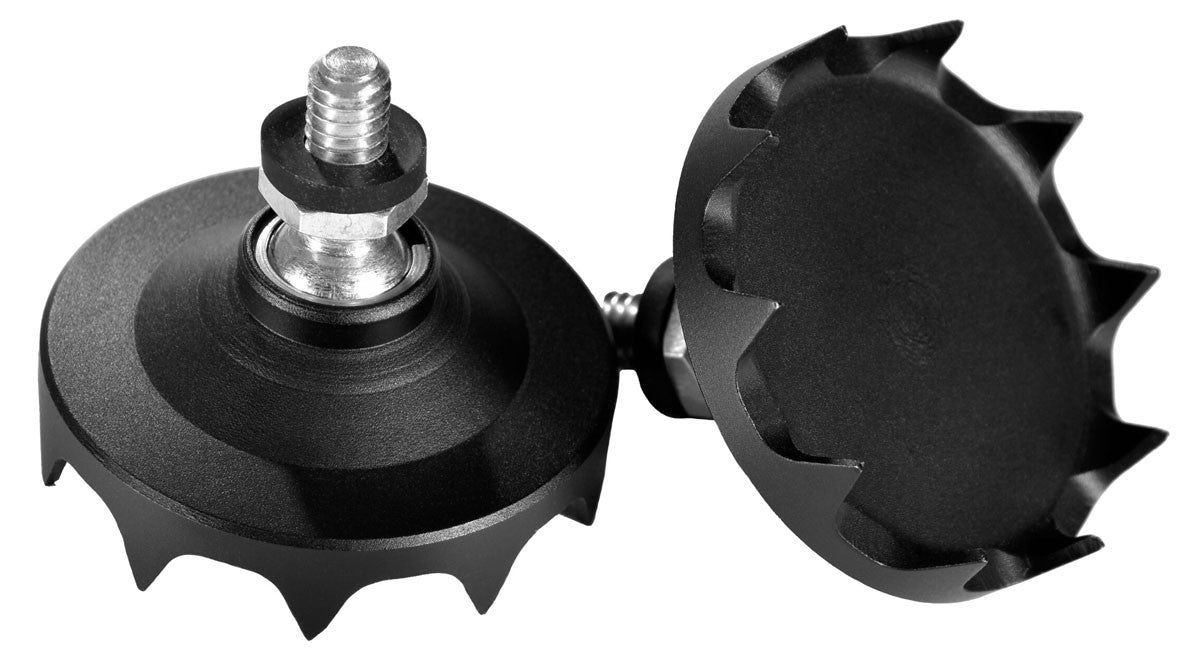 Fabricados en aluminio y acero inoxidable, los pies también están diseñados con una arandela de goma para evitar que las roscas se aflojen. Este diseño sin herramientas funciona simplemente atornillando el pie en su lugar en la pata del bípode hasta que quede apretado. Se puede usar una llave en las partes planas de la extensión roscada si se necesita fuerza adicional.