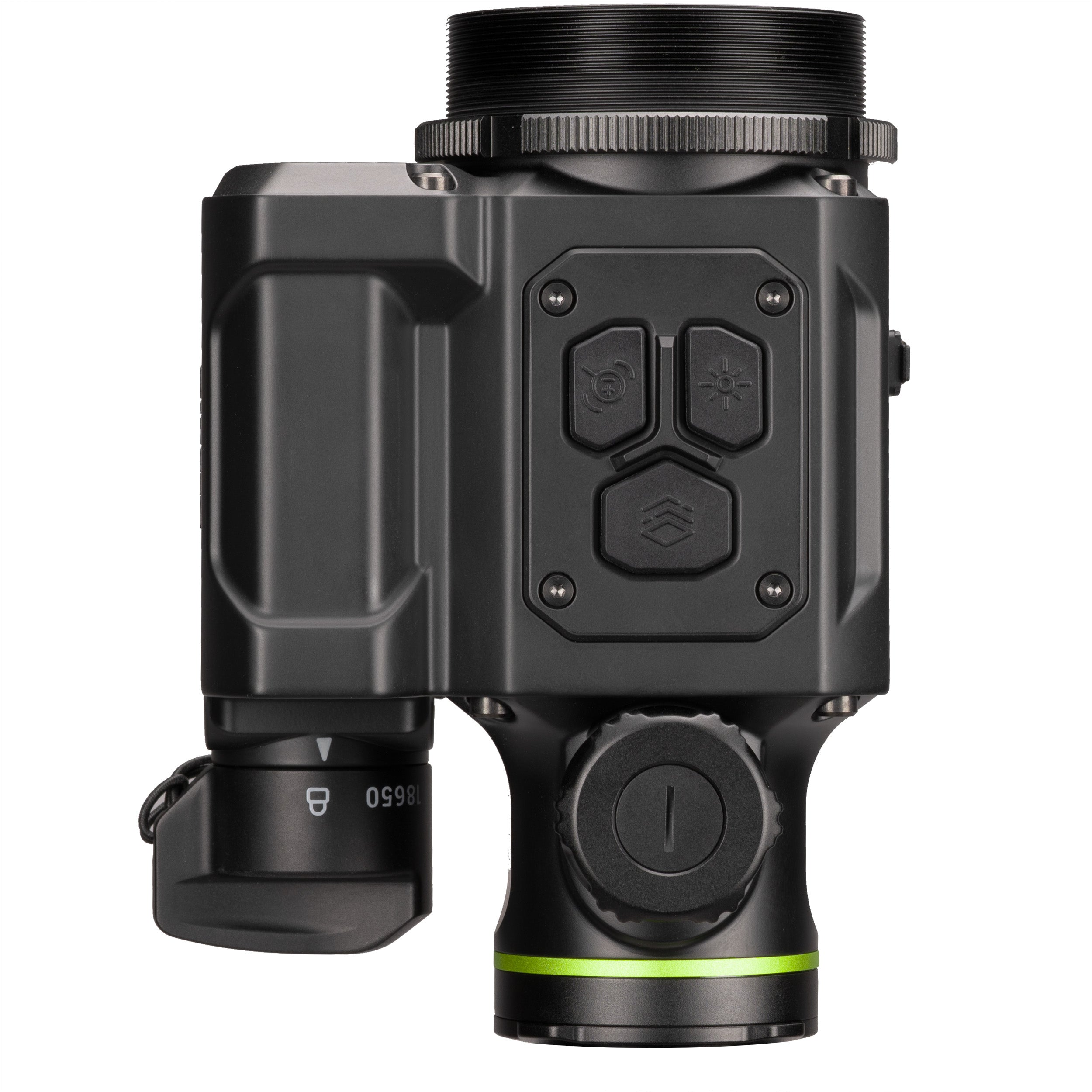 El dispositivo térmico acoplable se puede manejar de forma silenciosa e intuitiva gracias al diseño de 3 botones y a la rueda de enfoque ergonómica y suave. La navegación por el menú se puede realizar cómodamente mediante el mando a distancia Bluetooth incluido, que cuenta con una base magnética para fijarlo al arma.