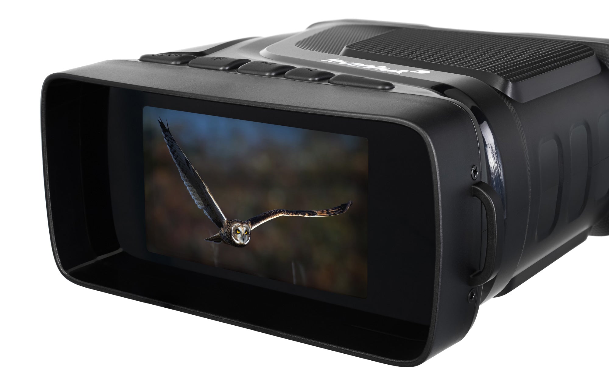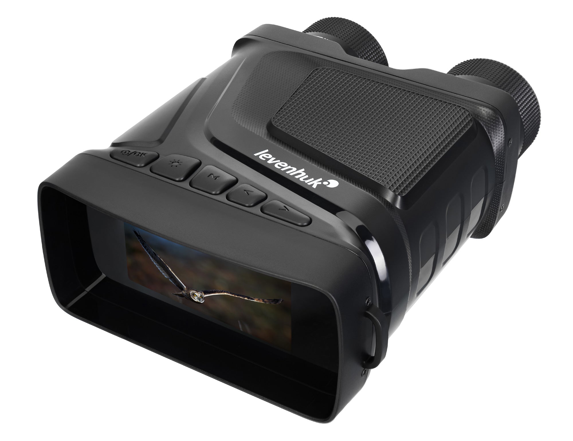 A la luz del día y al atardecer, la distancia de observación es ilimitada, y en completa oscuridad es de 250 a 300 metros. Los elementos ópticos de los prismáticos están hechos de vidrio y el cuerpo de plástico ABS de alta resistencia protege contra los golpes el sistema óptico de alta tecnología. La iluminación infrarroja por LED funciona con pilas recargables y tiene 7 niveles de brillo es fácil encontrar el modo de funcionamiento adecuado para ver imágenes por la noche. La función de apagado automático ahorra energía de la pila. El diámetro de las lentes y la resolución de la pantalla integrada son mayores que los del modelo DNB100, por lo que se pueden explorar más detalles en las imágenes.