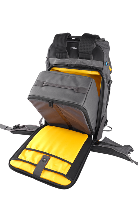 La mochila tiene múltiples bolsillos y compartimentos, además del compartimento fotográfico: Dos bolsillos interiores para un portátil de 13" y una tableta de 10". Compartimento superior independiente para el kit personal (o más kit de cámara). Bolsillo lateral para una bolsa de hidratación. Bolsillo lateral elástico. Compartimento trasero seguro para objetos de valor (como una cartera o un pasaporte). Bolsillos expansibles en el arnés de los hombros. Compartimento expandible en la cintura.
