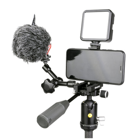 Además de una zapata rápida QS-72T que puede sostener cualquier cámara o smartphone de hasta 85 mm de ancho, y una gran cantidad de accesorios. Para su uso con smartphone hay una montura de cold shoe, perfecta para un una luz o un micrófono. En el lateral de la zapata hay un orificio de rosca de 1/4"para un brazo de soporte adecuado y otros accesorios.
