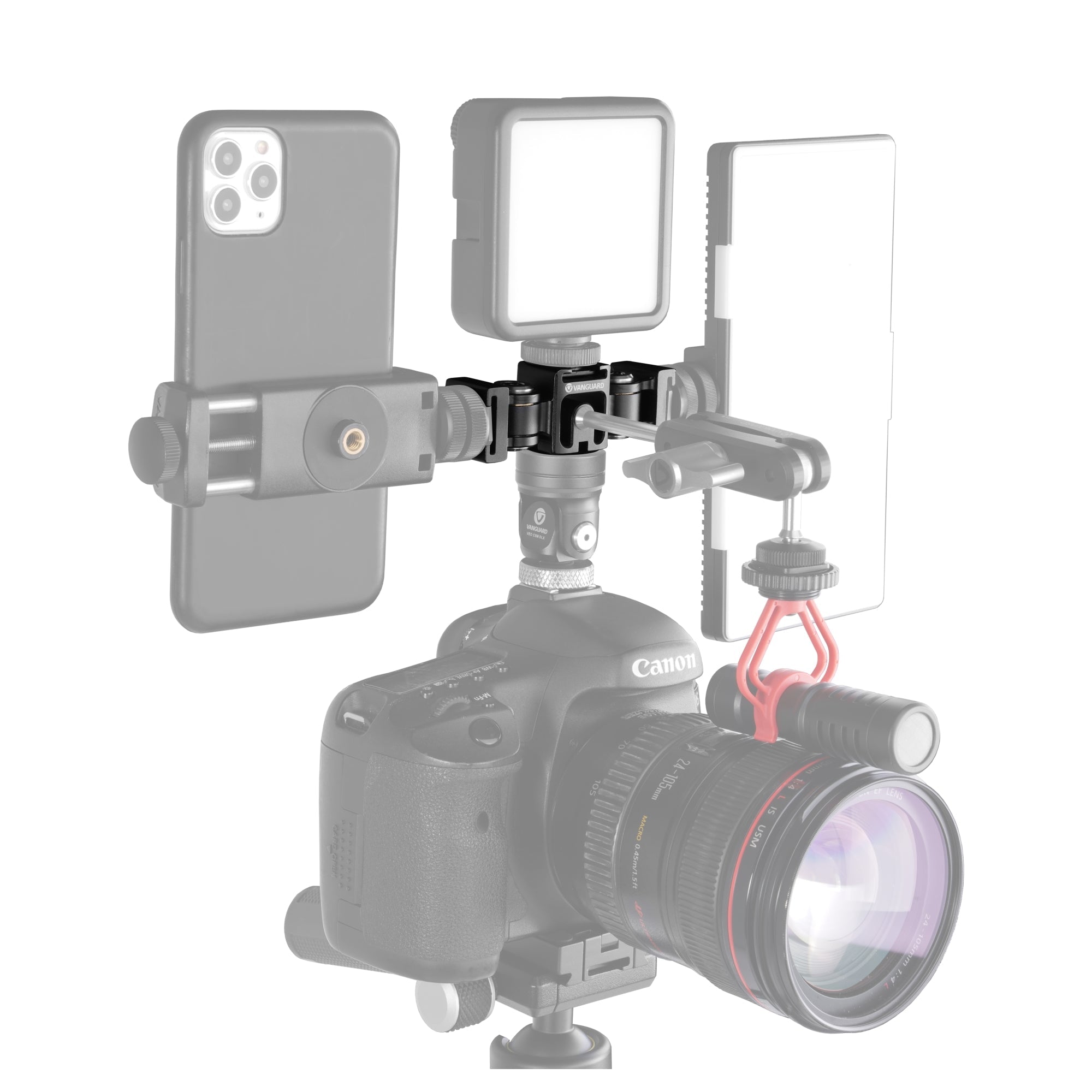 Para fijar tus accesorios, solo tienes que encajar el accesorio en la montura de cold shoe elegida y apretarla. A continuación, puedes ajustar el ángulo de cada montura de cold shoe lateral en 180° (de +90° a -90°). O si lo prefieres puedes bloquear la posición en su lugar empleando una llave Allen. En la parte delantera de cada montura de cold shoe hay una rosca de 1/4", que te permite acoplar cualquier brazo articulado u accesorios similares. En la base también hay una rosca de 1/4", lo que también permite acoplarla a cualquier brazo articulado.